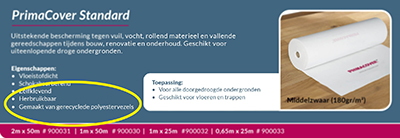 Wij gebruiken gerecyclede grondstoffen voor de vervaardiging van onze producten. Ook dit sluit aan bij onze duurzaamheidsdoelstellingen. Voorbeelden hiervan zijn de gerecyclede polyestervezels van onze PrimaCover afdekvliezen en het gerecycled karton voor onze Ram Board producten. Restmateriaal dat ontstaat tijdens het productieproces wordt verzameld en opnieuw verwerkt tot grondstof.