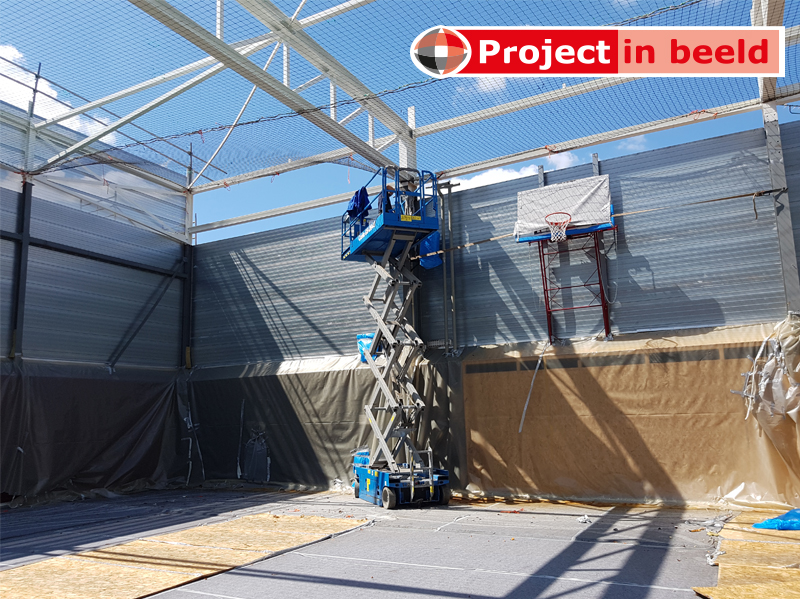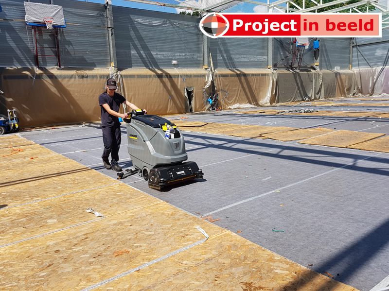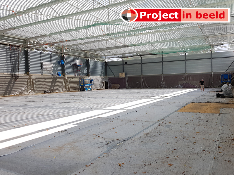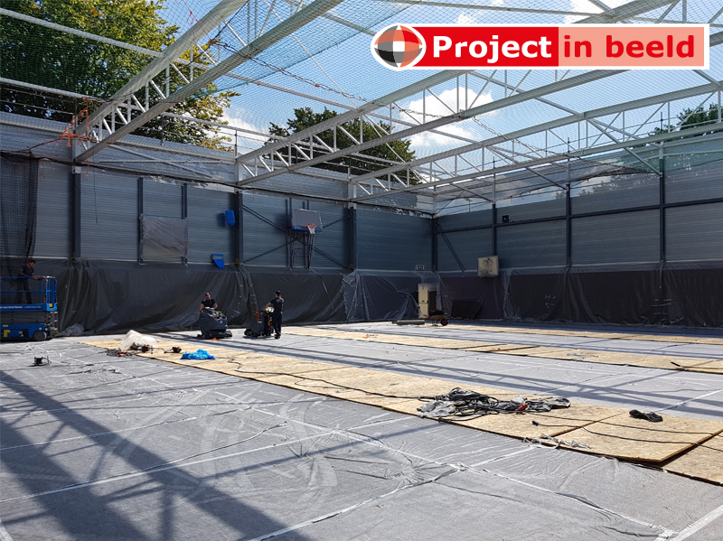 De productadviseurs van PrimaCover krijgen de meest uiteenlopende vragen. Zo ook tijdens de voorbereidingen van een grootscheepse renovatie van Sporthal De Grenslibel in Stramproy (Limburg). De aannemer en de eigenaar (in dit geval Gemeente Weert) vroegen advies over de bescherming van de sportvloer. Bijzonder detail: tijdens de renovatie zou de sporthal wekenlang dakloos zijn. De dakbedekking was namelijk aan vervanging toe. Ook was het noodzakelijk om de zaal hoger te maken en te voorzien van een compleet nieuwe overspanning die geschikt was voor het plaatsen van zonnepanelen. De totale renovatieperiode bedroeg 3 maanden. Vanzelfsprekend mochten de zware hoogwerkers en bouwmaterialen de vloer niet beschadigen. PrimaCover Robust bleek de perfecte vloerbeschermer. Dit is een drielaags afdekvlies voor binnen en buiten.